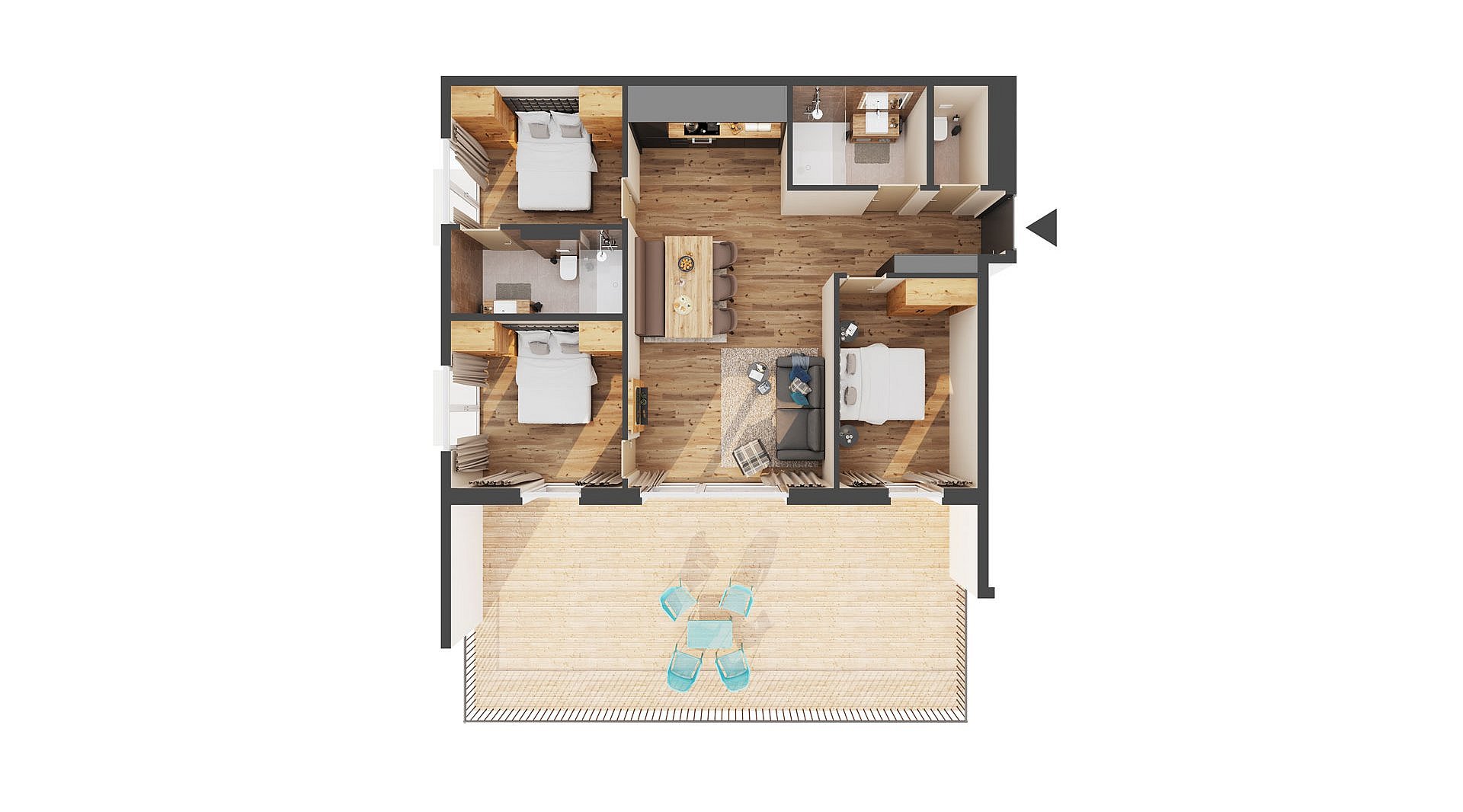 3 Schlafzimmer, 2 Bäder mit Dusche, Küche & Essbereich mit Vollausstattung, 4 Flatscreens mit Bluetooth Verbindung zum Handy, Balkon oder Terrasse mit Loungemobiliar.